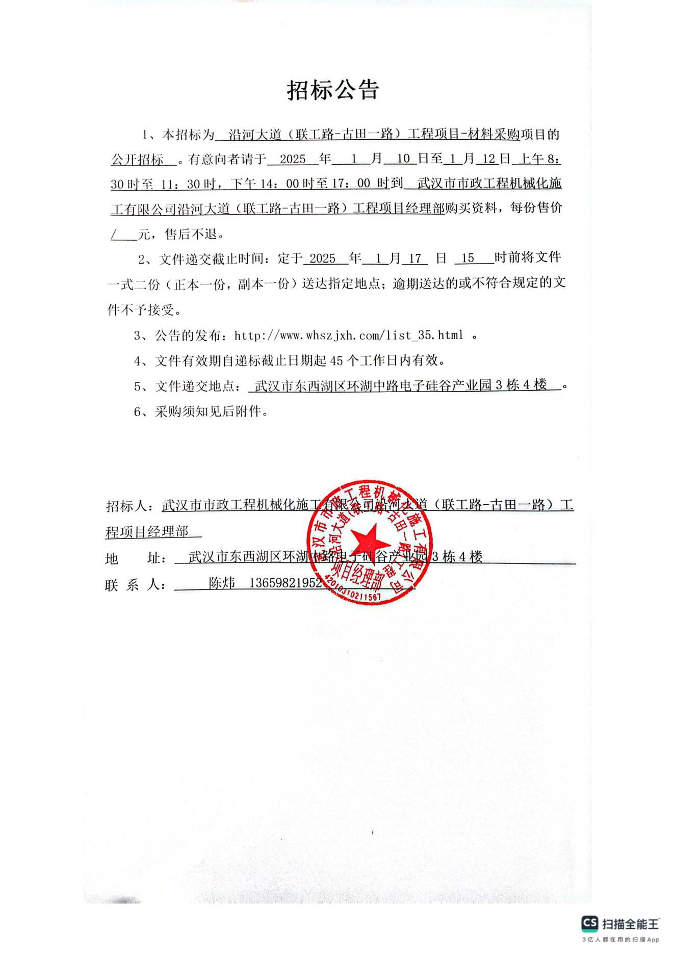 沿河大道(聯(lián)工路-古田一路)工程-材料采購招標公告