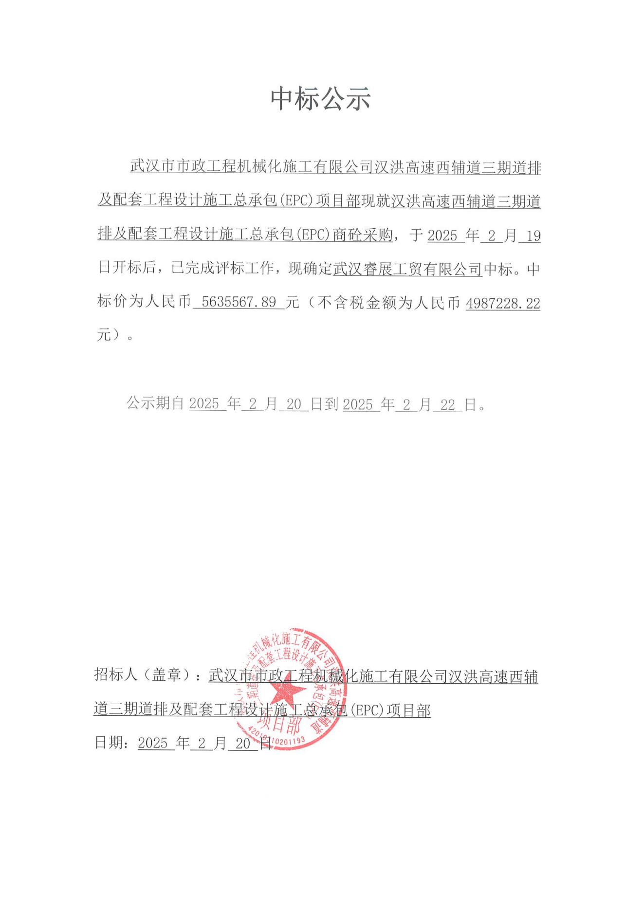 漢洪高速西輔道三期道排及配套工程設(shè)計(jì)施工總承包(EPC)商砼采購中標(biāo)公示