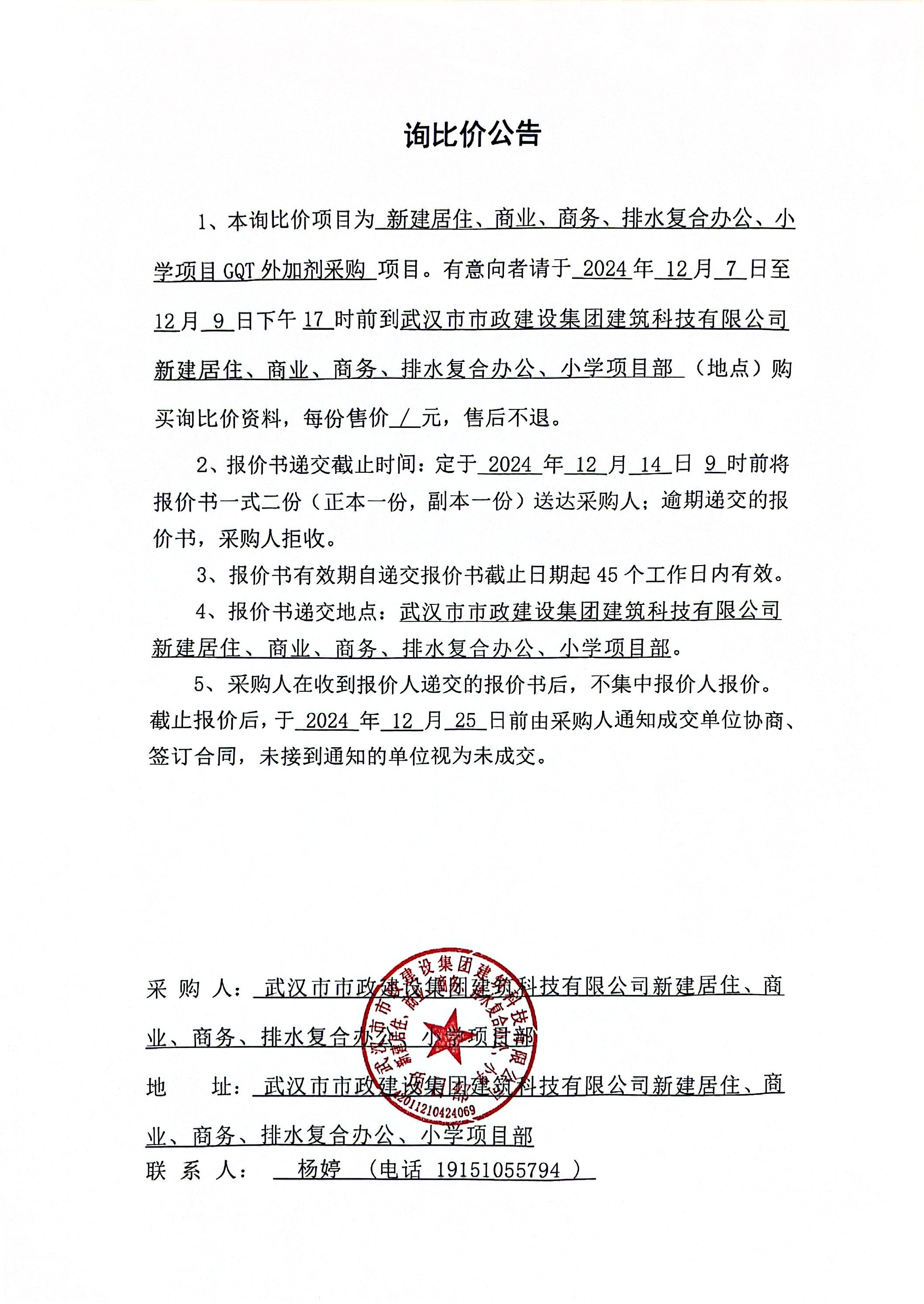 武漢市市政建設(shè)集團建筑科技有限公司新建居住、商業(yè)、商務(wù)、排水復(fù)合辦公、小學(xué)項目GQT外加劑采購詢價公告