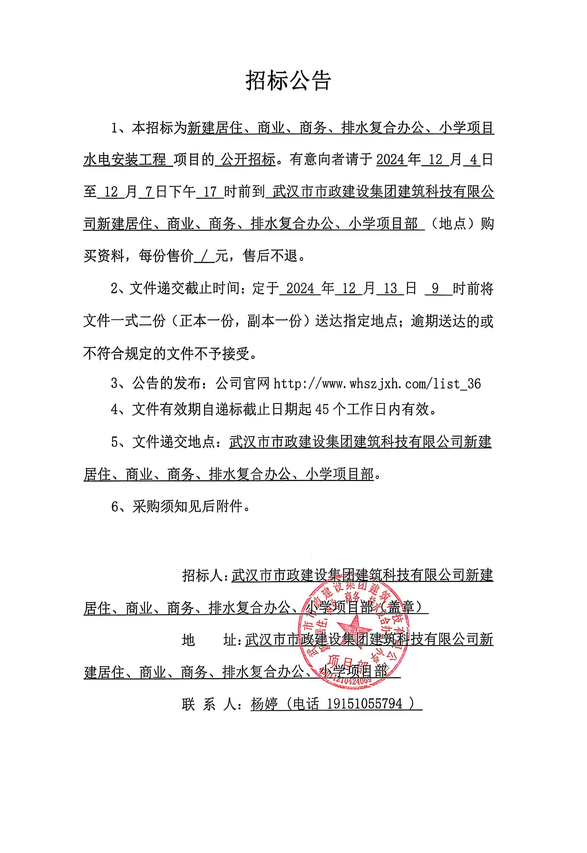 武漢市市政建設(shè)集團(tuán)建筑科技有限公司新建居住、商業(yè)、商務(wù)、排水復(fù)合辦公、小學(xué)項(xiàng)目水電安裝工程招標(biāo)公告