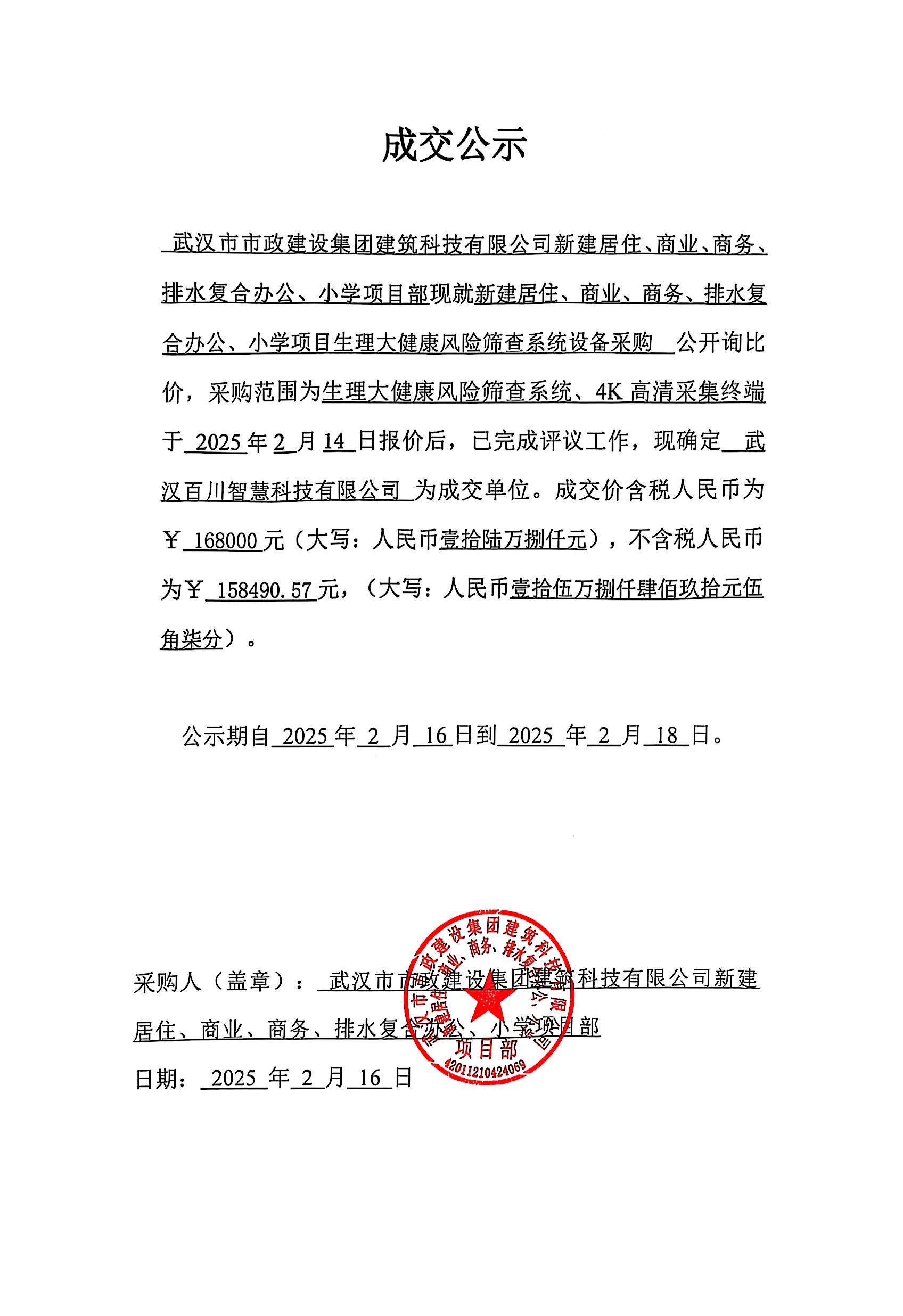 武漢市市政建設(shè)集團(tuán)建筑科技有限公司新建居住、商業(yè)、商務(wù)、排水復(fù)合辦公、小學(xué)項(xiàng)目生理大健康風(fēng)險篩查系統(tǒng)設(shè)備采購成交公示