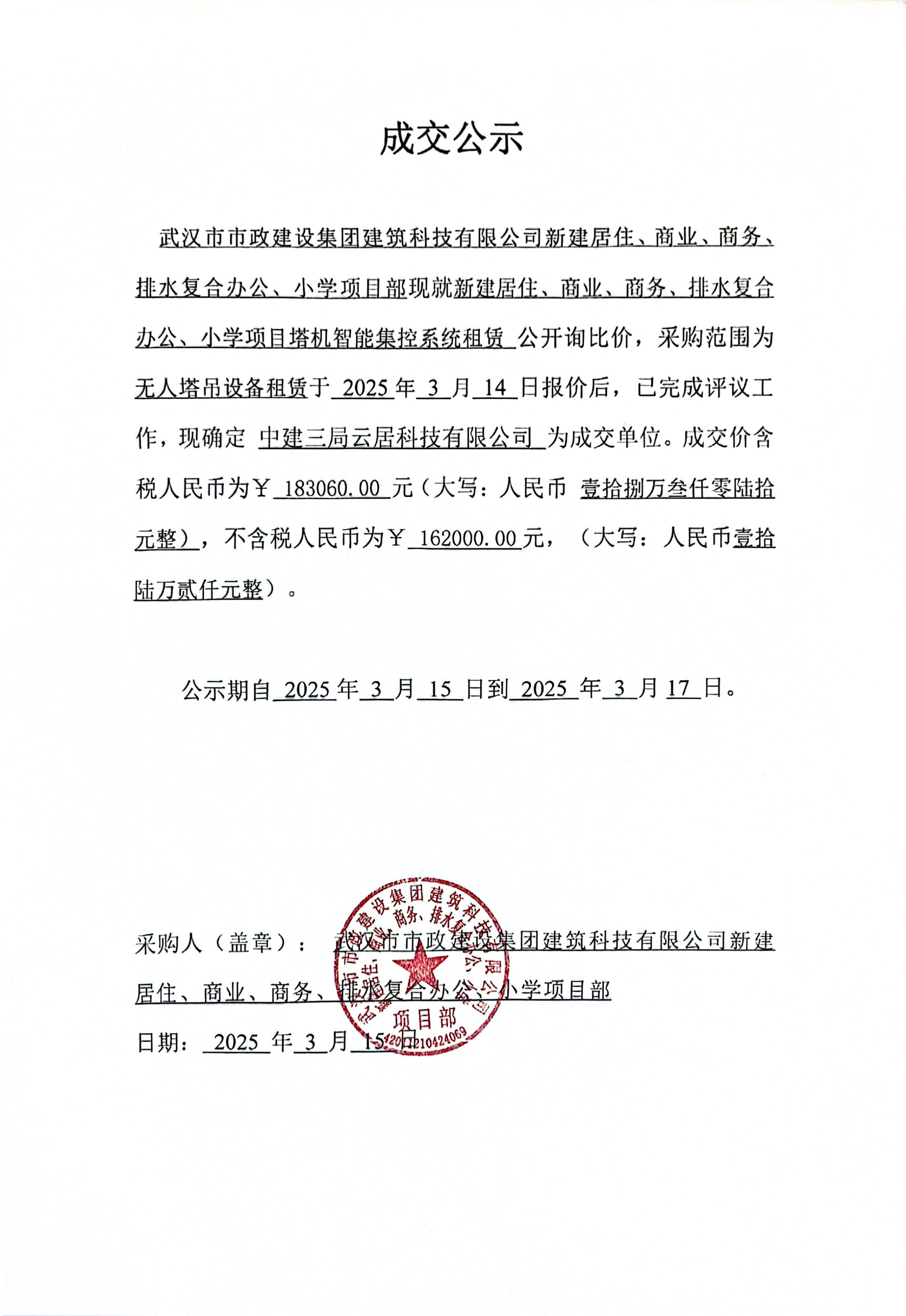 武漢市市政建設(shè)集團(tuán)建筑科技有限公司新建居住、商業(yè)、商務(wù)、排水復(fù)合辦公、小學(xué)項(xiàng)目塔機(jī)智能集控系統(tǒng)租賃成交公示