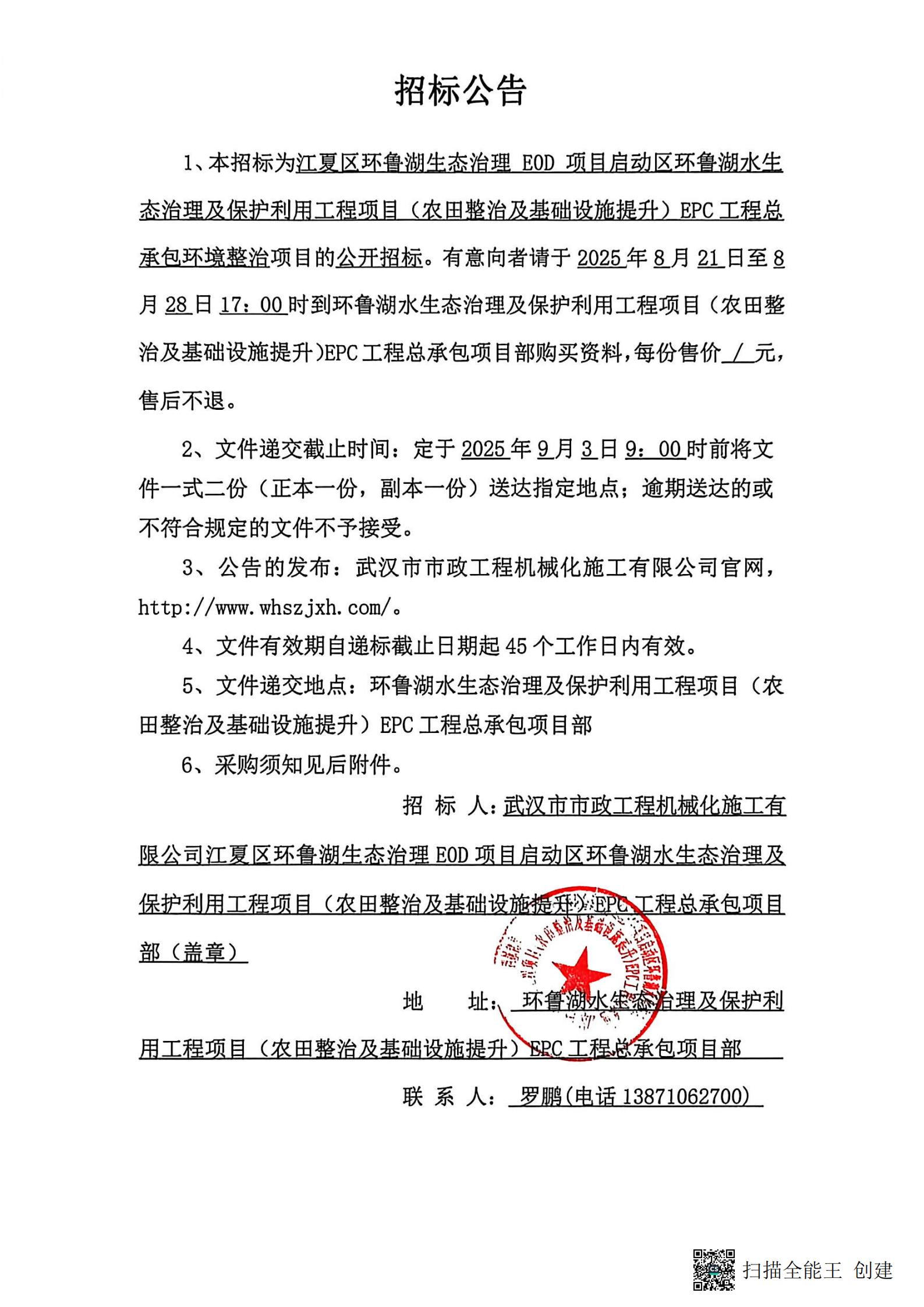 江夏區(qū)環(huán)魯湖生態(tài)治理 E0D 項(xiàng)目啟動(dòng)區(qū)環(huán)魯湖水生態(tài)治理及保護(hù)利用工程項(xiàng)目(農(nóng)田整治及基礎(chǔ)設(shè)施提升)EPC工程總承包環(huán)境整治招標(biāo)公告
