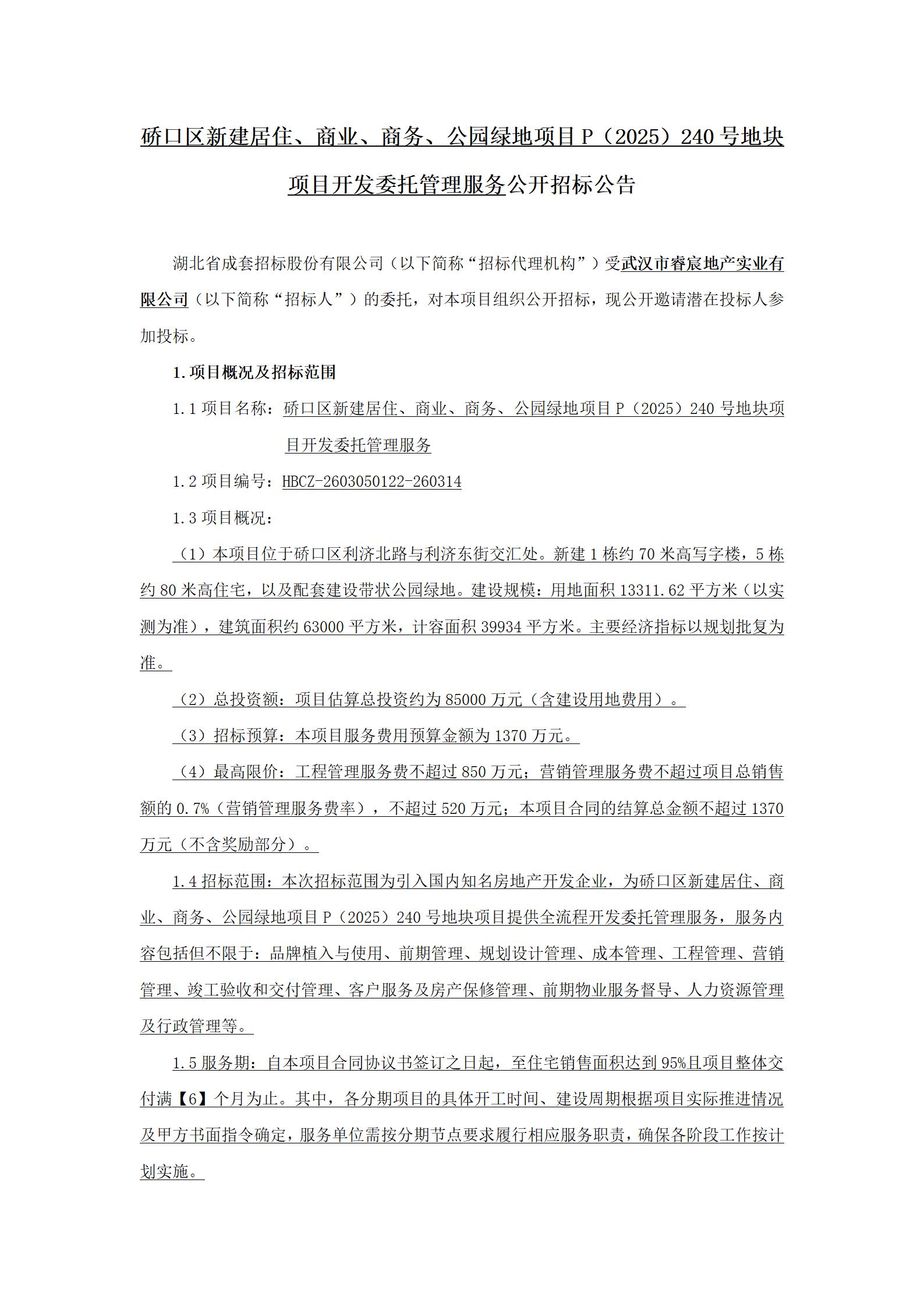 武漢市睿宸地產(chǎn)實業(yè)有限公司-硚口區(qū)新建居住、商業(yè)、商務(wù)、公園綠地項目P(2025)240號地塊項目開發(fā)委托管理服務(wù)招標公告
