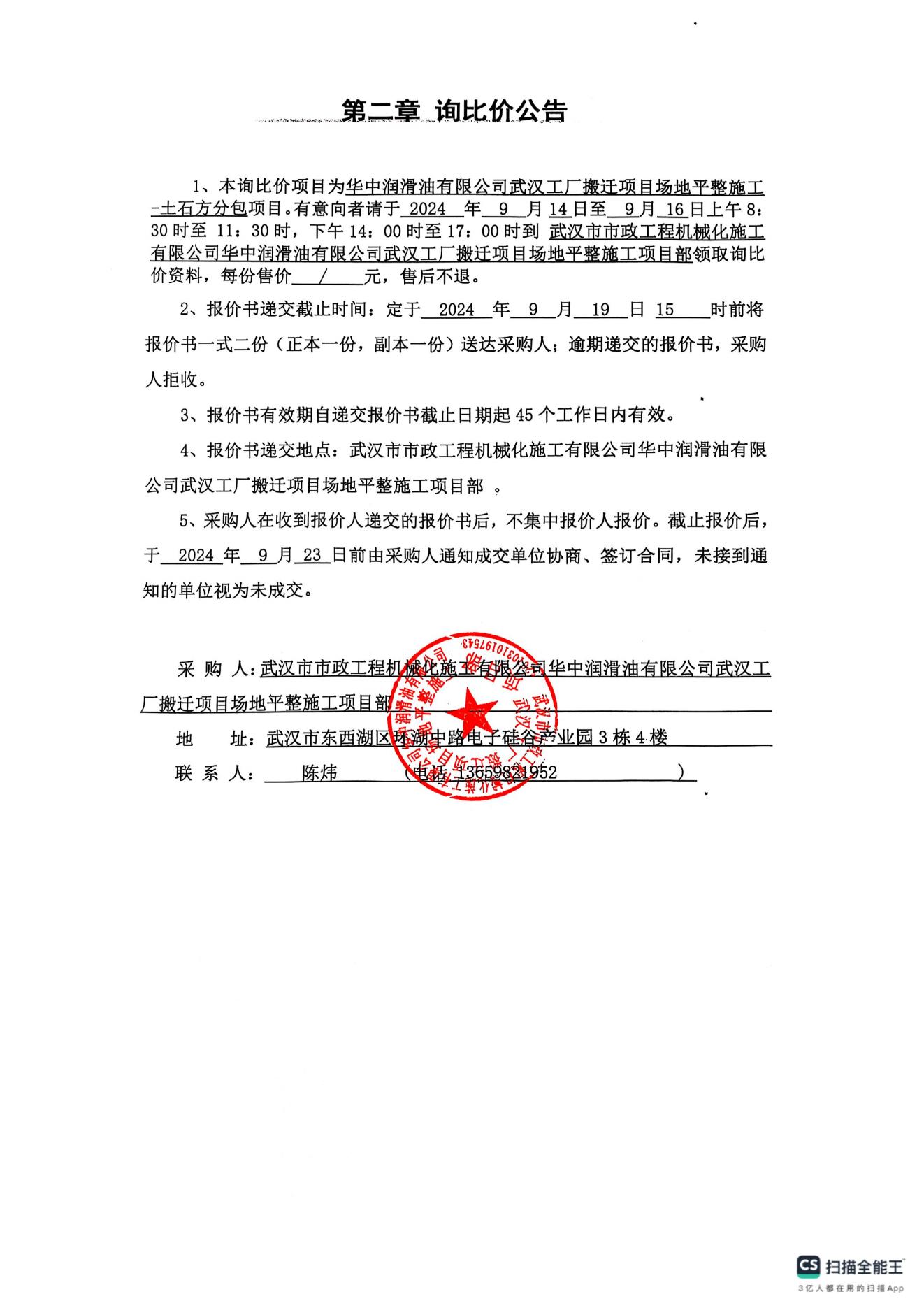 華中潤滑油有限公司武漢工廠搬遷項(xiàng)且場地平整施工土石方分包詢價(jià)公告