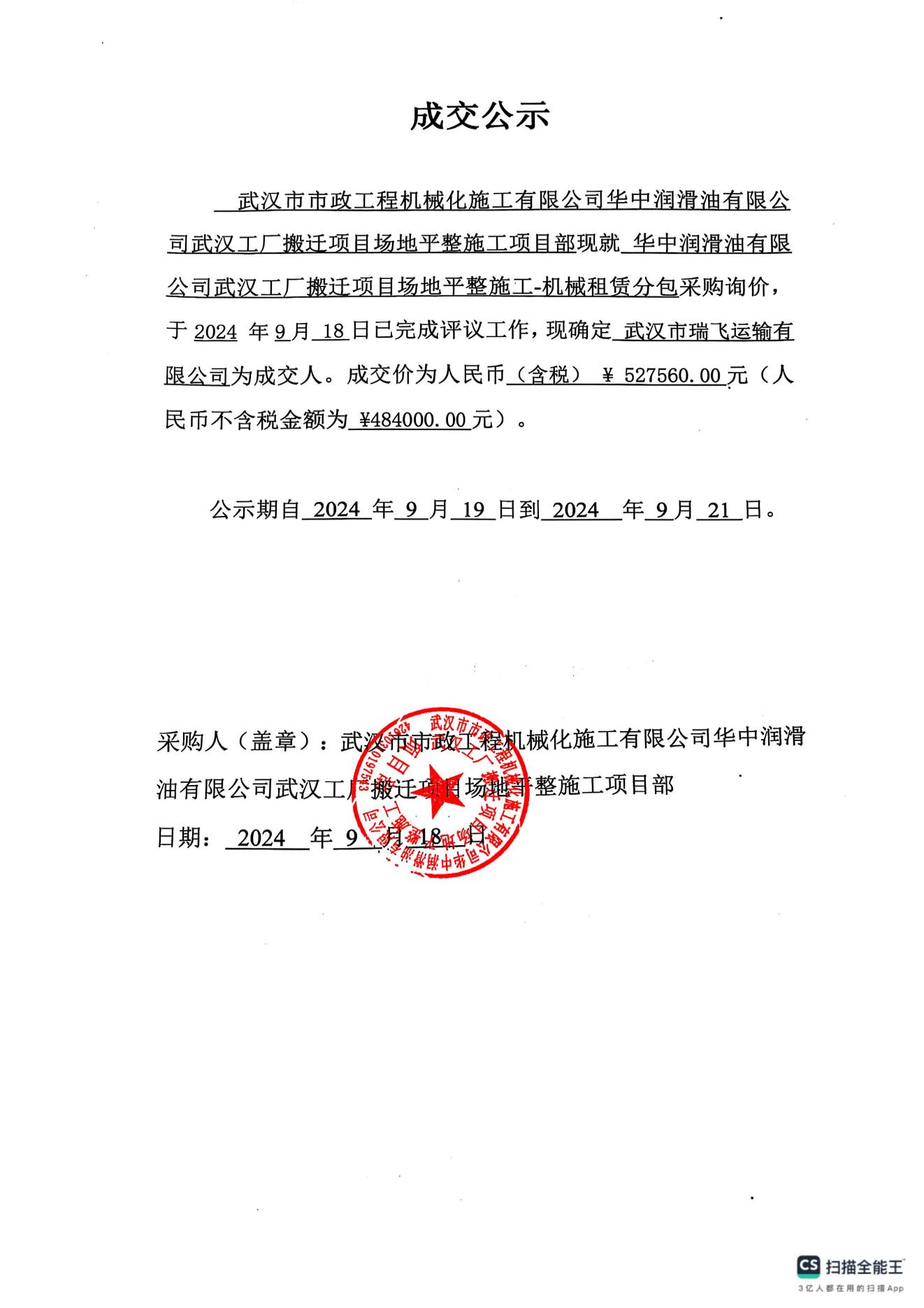 華中潤(rùn)滑油有限公司武漢工廠搬遷項(xiàng)且場(chǎng)地平整施工機(jī)械租賃分包成交公示