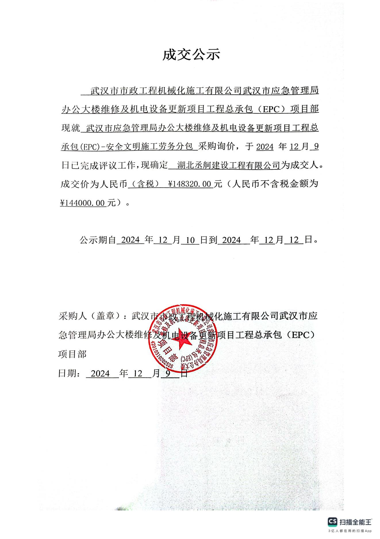 武漢市應(yīng)急管理局辦公大樓維修及機電設(shè)備更新項目工程總承包(EPC)-安全文明施工勞務(wù)分包成交公示