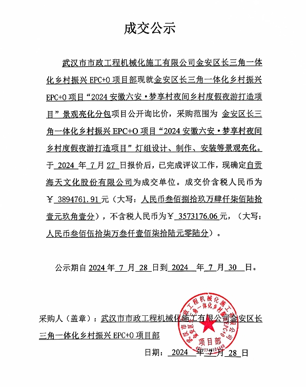 金安區(qū)長(zhǎng)三角一體化鄉(xiāng)村振興EPC+O項(xiàng)目“2024安徽六安·夢(mèng)享村夜間鄉(xiāng)村度假夜游打造項(xiàng)目”景觀亮化分包成交公示