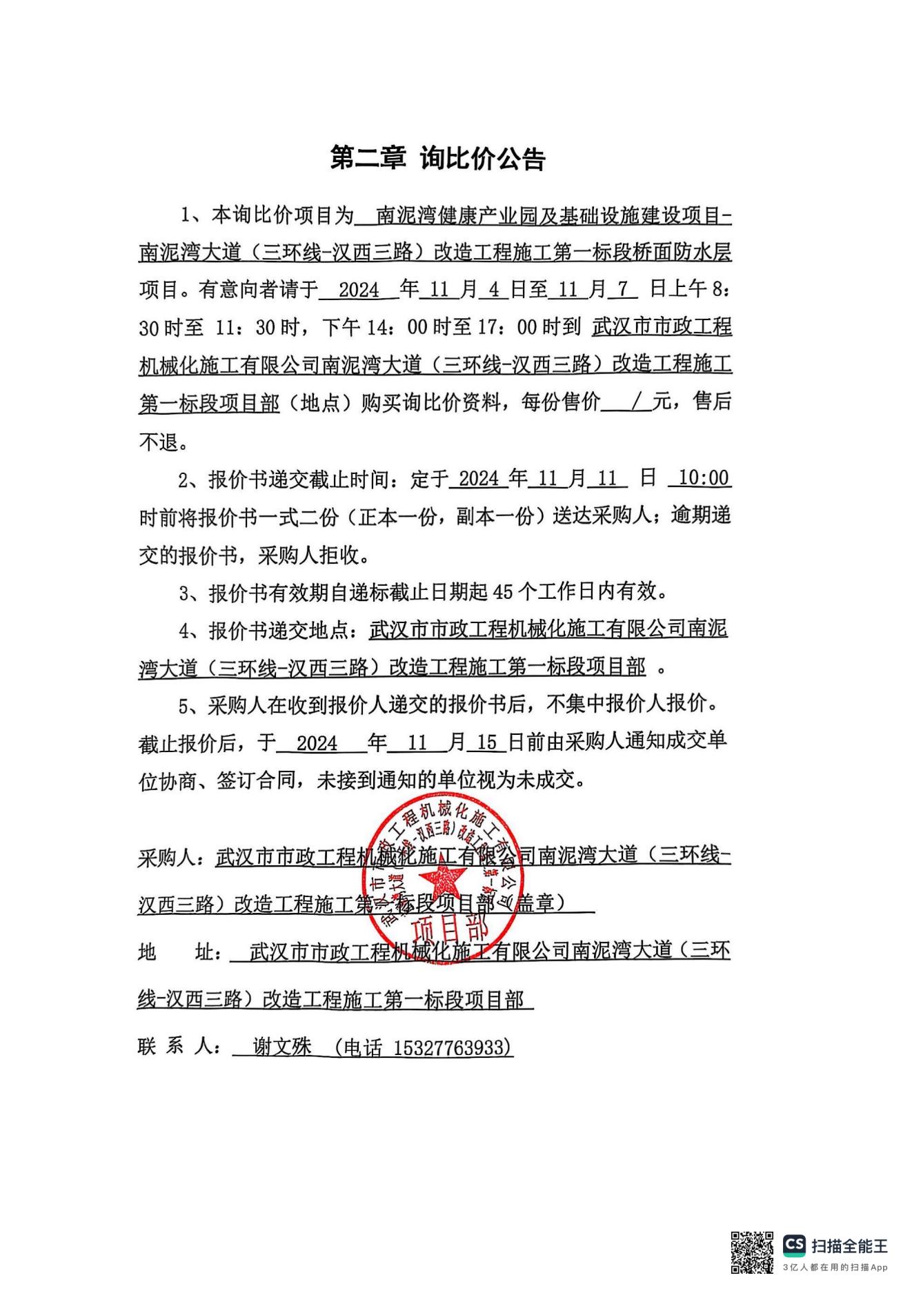南泥灣健康產(chǎn)業(yè)園及基礎(chǔ)設(shè)施建設(shè)項(xiàng)目-南泥灣大道(三環(huán)線-漢西三路)改造工程施工第一標(biāo)段橋面防水層詢價(jià)公告