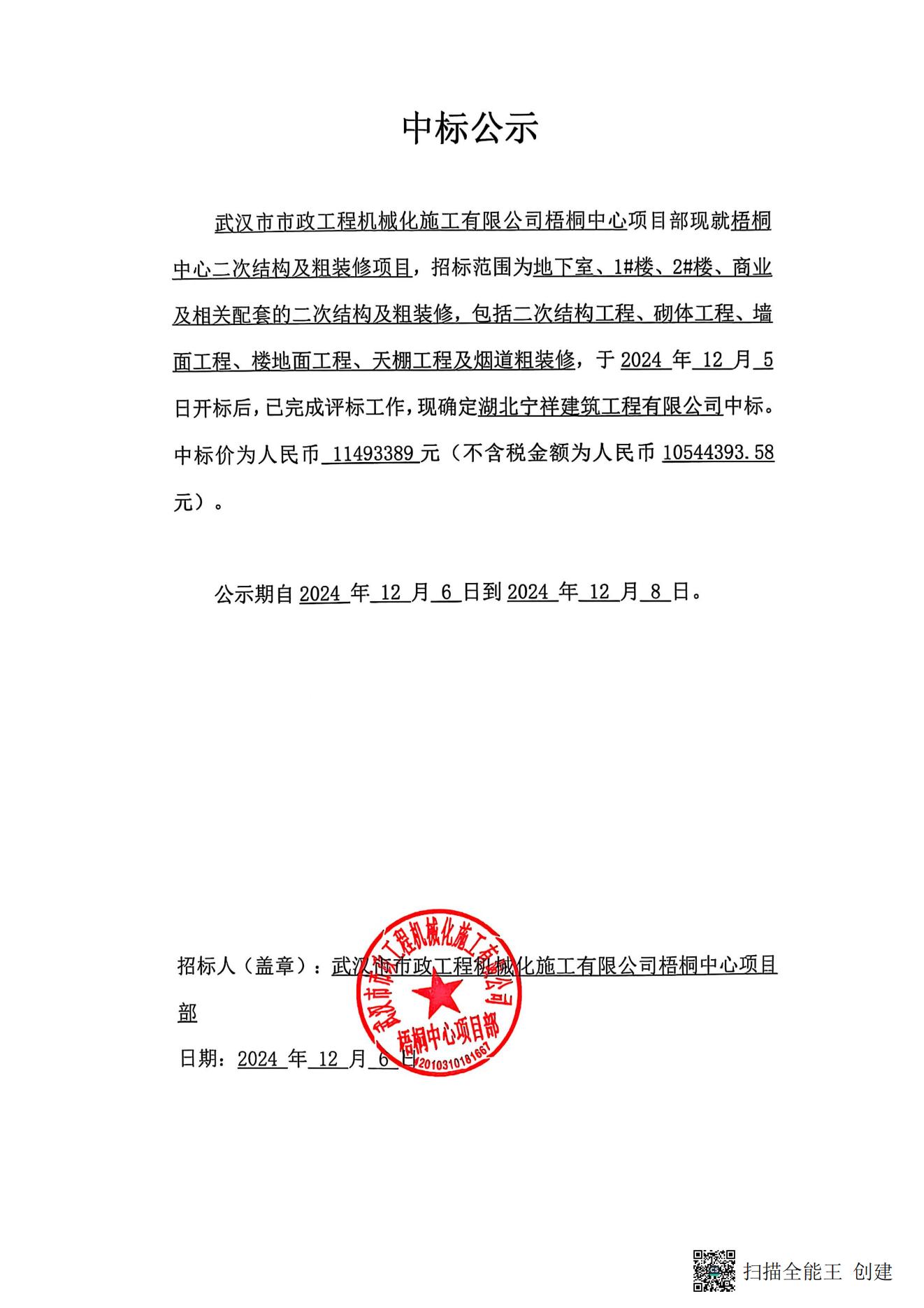 梧桐中心二次結(jié)構(gòu)及粗裝修中標(biāo)公示