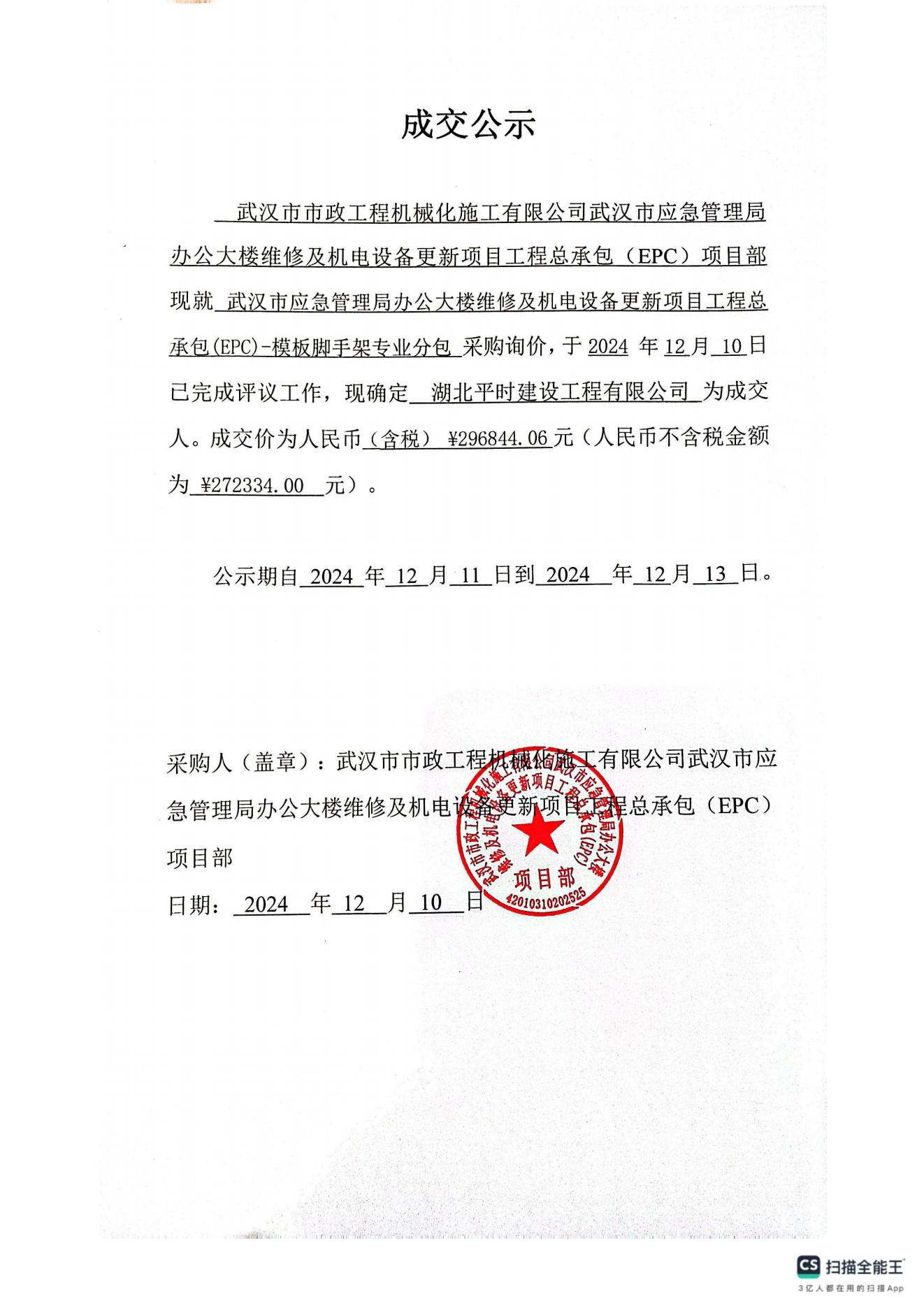 武漢市應急管理局辦公大樓維修及機電設備更新項目工程總承包(EPC) -模板腳手架專業(yè)分包成交公示